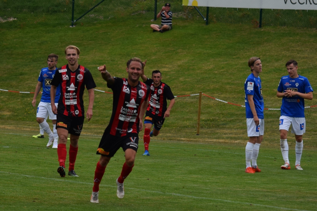 Bildserie, bild 6 av 6 Christoffer Söderlund närmast jublar över målet. Bakom ser vi Anton Henriksson och Granit Berisha ganska nöjda dom med