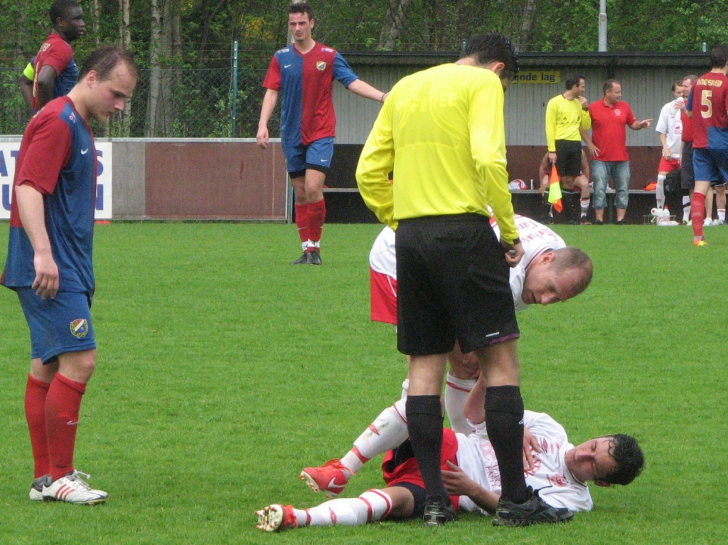 Granit Berishas tur att ligga ner efter en smäll. Jonas Henriksson kollar hur det står till. Även Gunnilses Nicholas Andersson kollar på nyfiket.