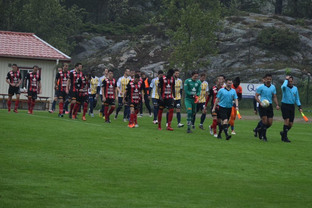 Domarteamet leder lagen ut på planen. Observera att Nordvärmland kommer i Grebbestads förre bortaställ