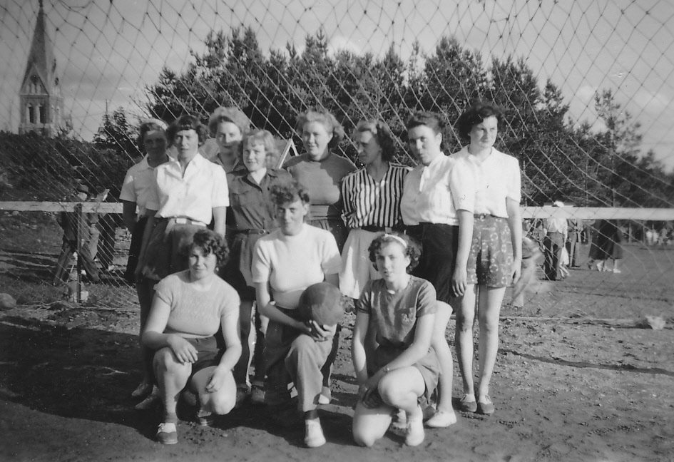 Bakre raden fr vä: NN, Greta Olsson, Gerd Landgren?, NN, NN, Gerd Listad (gift med Olle Listad), Lisa Andersson (gift med Roy A), Ella "i Röd" Johansson. Knästående fr vä: NN, målvakt Stina Karlsson (gift med Stor-Harry), Aina Olsson (gift med Kjell Olsson)