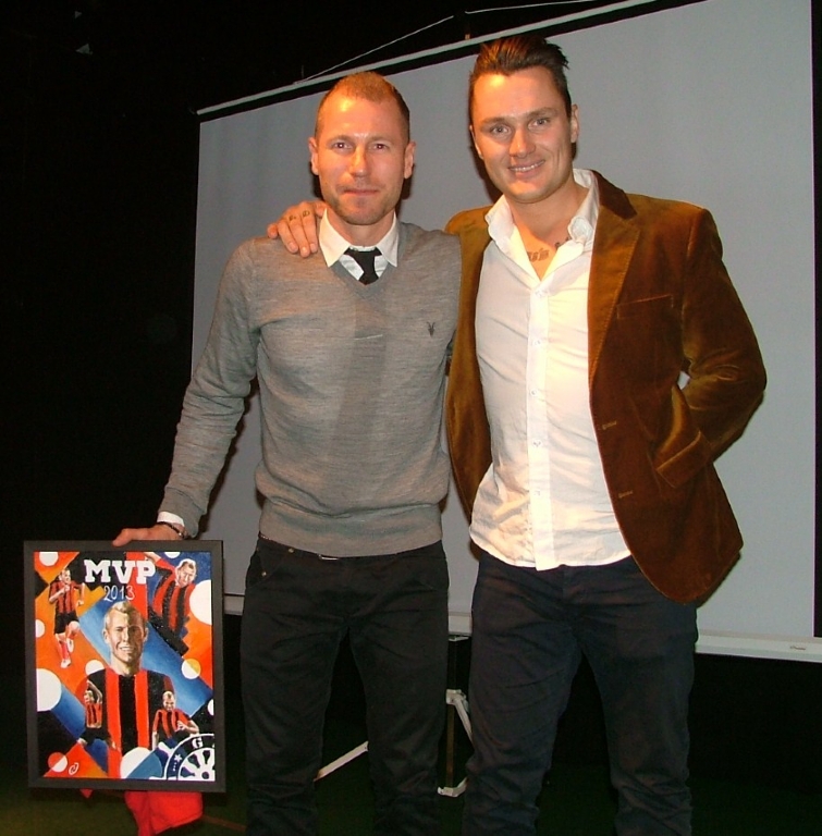 Jonas Henriksson får MVP-priset av GIF Ultras Klas Johansson.