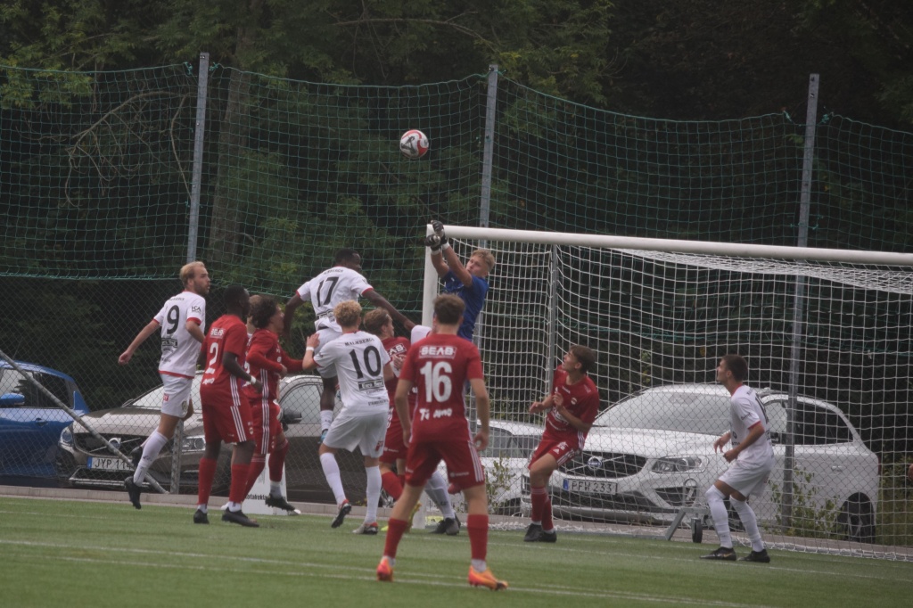 Oliver Bergman kommer och och boxar resolut bort bollen