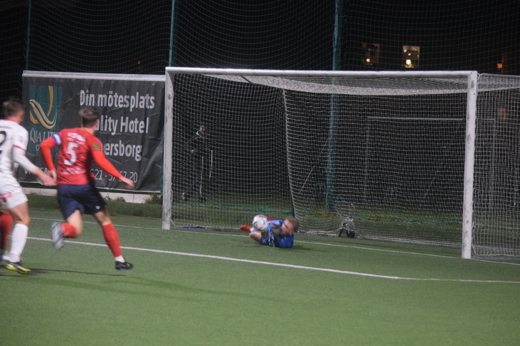 Bildserie, bild 1 av 5 Oliver Bergman räddar en frispark men tvingas släppa retur...