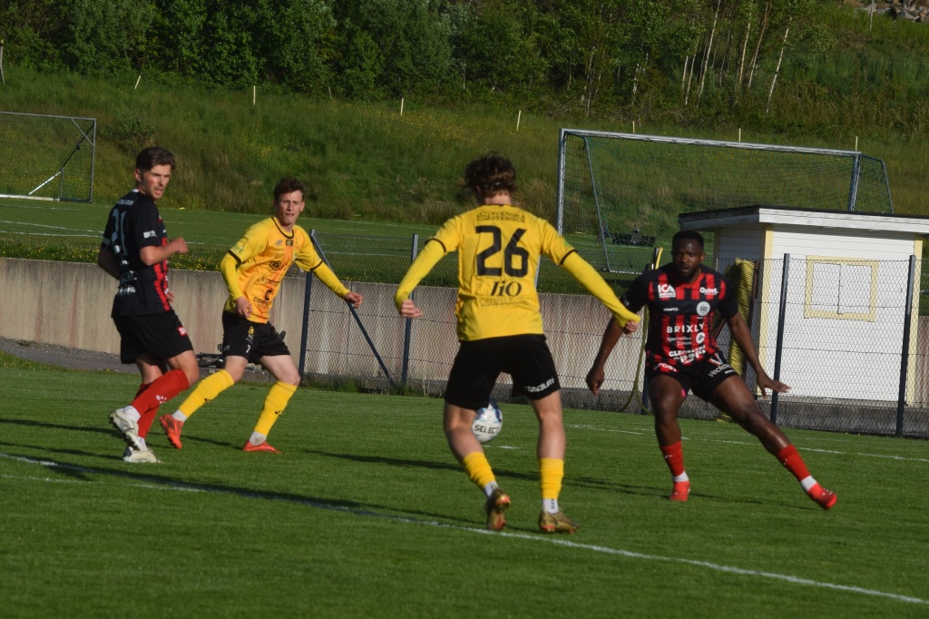 Linus får bollen och han har Philip Hällgren och Louis Souffo mot sigÅvall