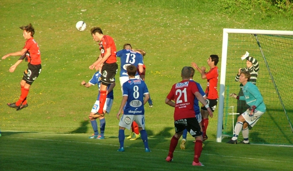 En Grebbestadsfrispark som lyfts in. Tobias Carlsson och Patrik Adamczyk är båda uppe och försöker nicka.