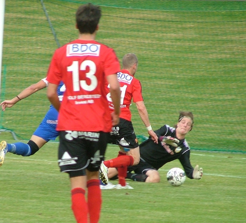 Jonas Henriksson på väg igenom men Åmåls målvakt Benjamin Rehnlund kommer ut och lägger beslag på bollen