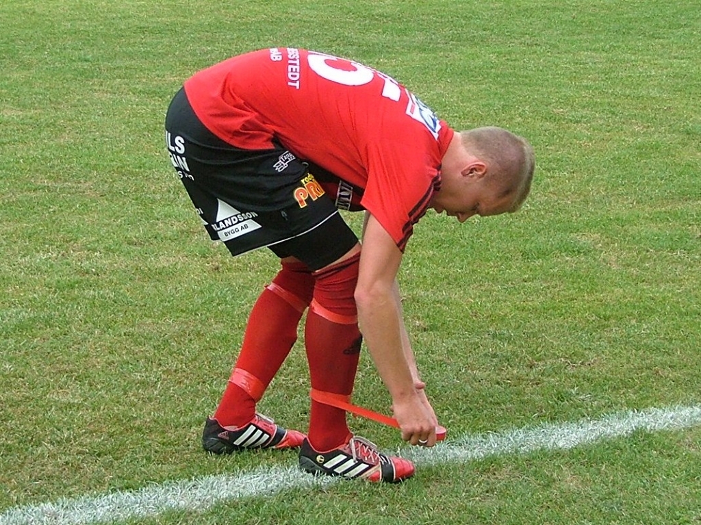 Utrustningen ,måste sitta rätt. Markus Svensson snurrar på ny tape på benskydden