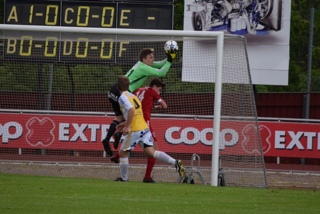 Jonatan Hårenberg fångar bollen framför Skövdes Florian Brahimi