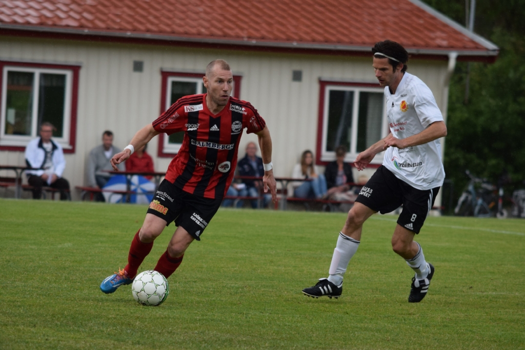 Jonas Henriksson med fokuserad blick, jagandes av en Skoftebyspelare