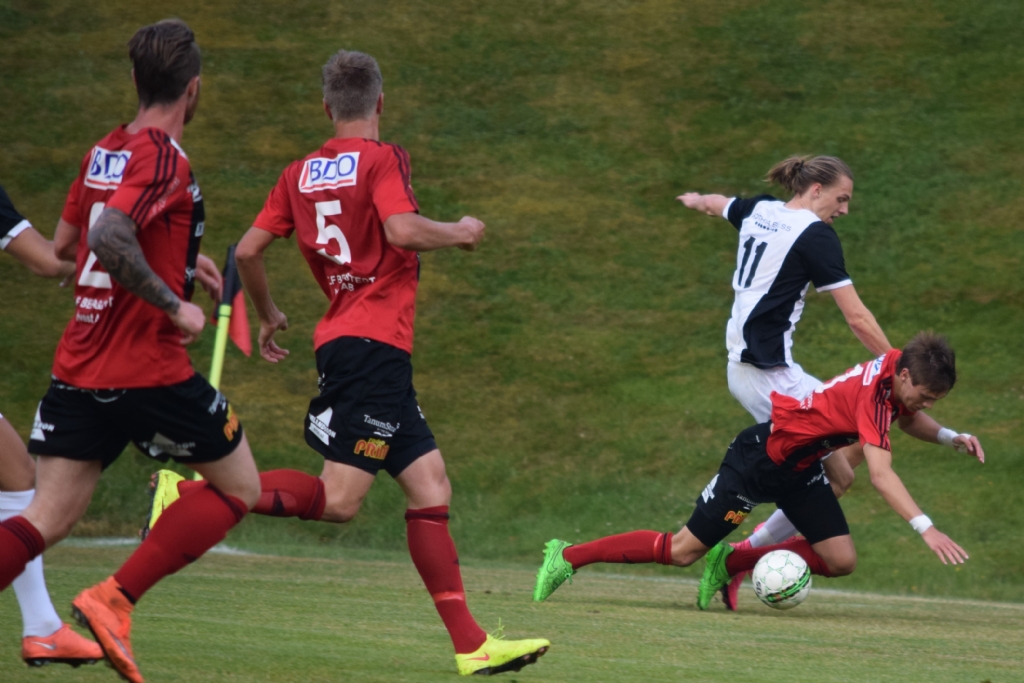 Tobias Carlsson trycks ner av Robin Örtendahl. Ulrik Karnström och Felix Norén bra med om domaren inte blåst frispark