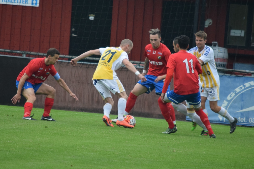 Jonas Henriksson med bollen och han har med sig Granit Berish (nästan dold) och Rickard Johansson