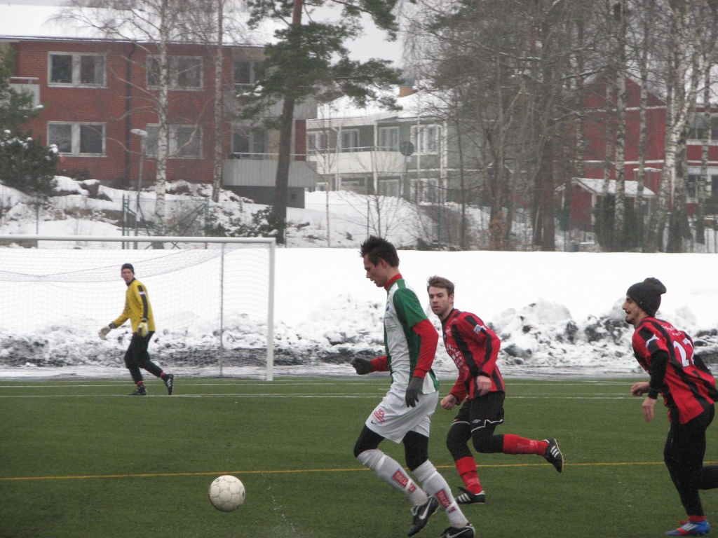 Gustav Kjellström med bollen. Marcus Broberg och Arbber Plava jagar efter samt Martin Hansson i mål intar sin position