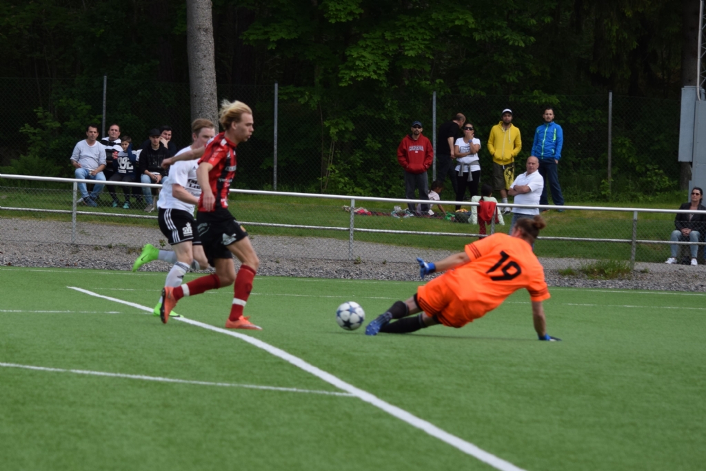 Bildserie, bild 3 av 3 Anton Henrikssons friläge räddas av Michael Källehult. Olyckligtvis slutade jag ta kort. Men returen hamnade tillbaka till Anton som kunde rulla in 0-1