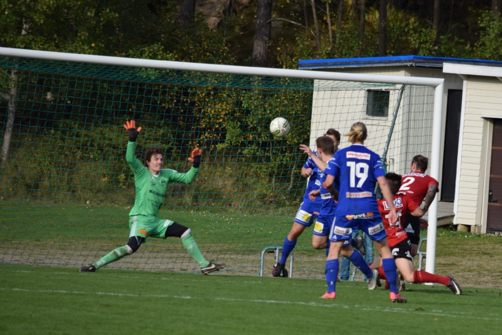 Bildserie, bild 2 av 4 Jonatan Nilssons skott på väg in i mål. Bollbanan en aning konstig så dålig träff eller en försvarande touch?