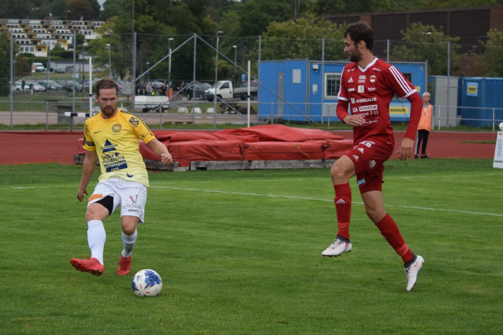 Tobias Mikaelsson försöker stoppa Jimmie Larssons passning