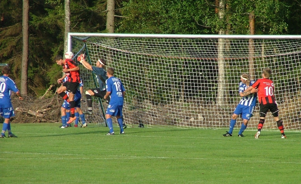Daniel Andersson i duell med Lanes målvakt på en hörna. Daniel vinner duellen med nacken men bollen smiter över.