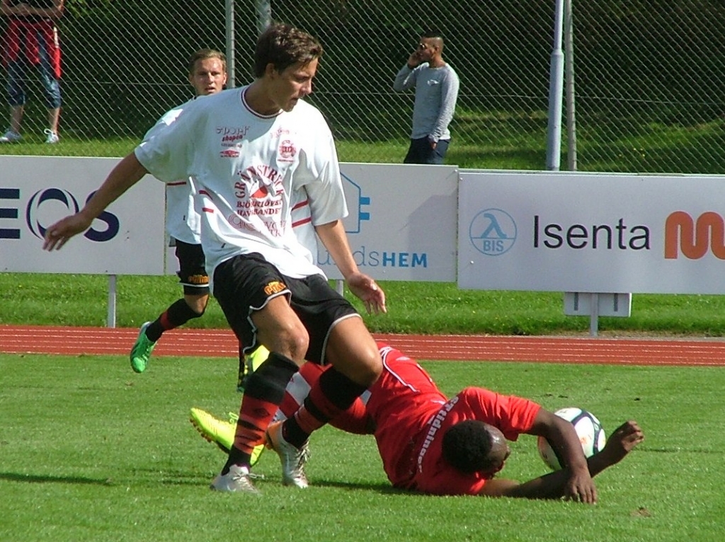 Stenungsunds John B Niyonsaba går i backen i en duell med Daniel Andersson men det hela slutar med frispark för Grebbestad och varning för John B Niyonsaba.
