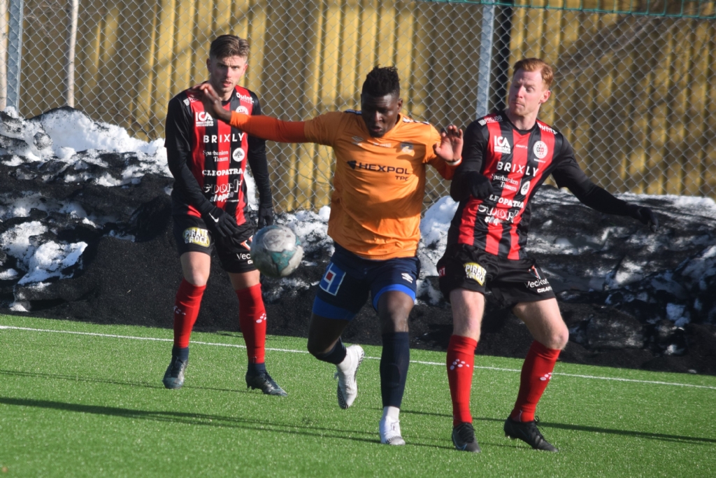 Ferdinand Fon Fru i kamp med Joakim Berggren. Philip Hällgren med täckning bakom