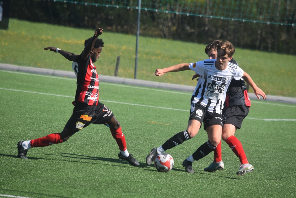 Isak Pettersson-Pohl med bollen kämpandes mot Adeek Galleyr och Philip Hällgren