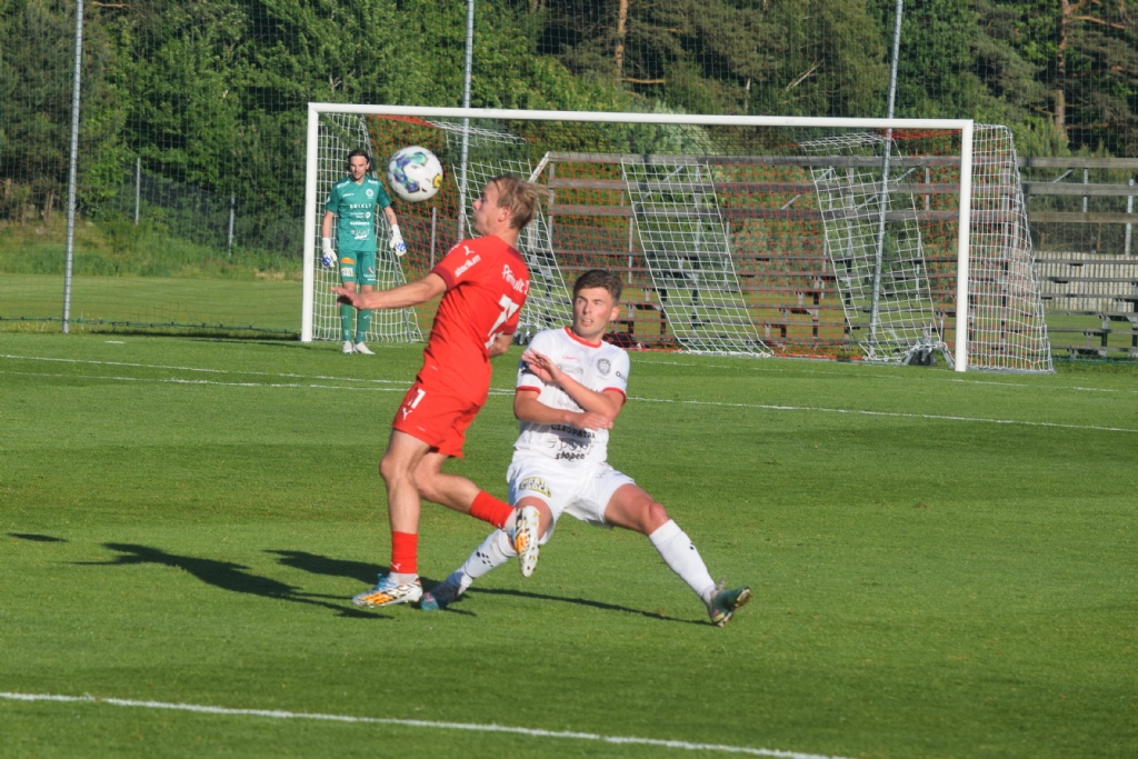Elliott Bäcklund in framför Philip Hällgren och tar med sig bollen med bröstet