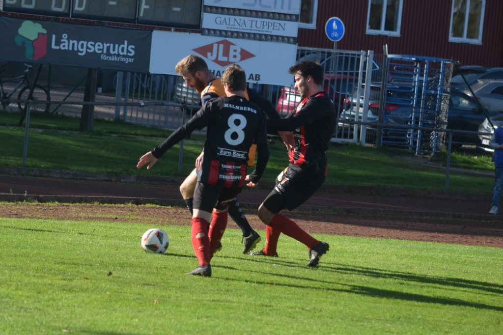 Fredrik Larsson täcker boll mot Victor Edvardsson och Patrik Adamczyk