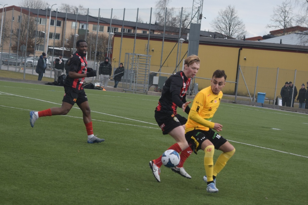Eliyo Türkan får ett uppspel. Viggo Gustavsson tätt på och Louis Souffo nära som backup