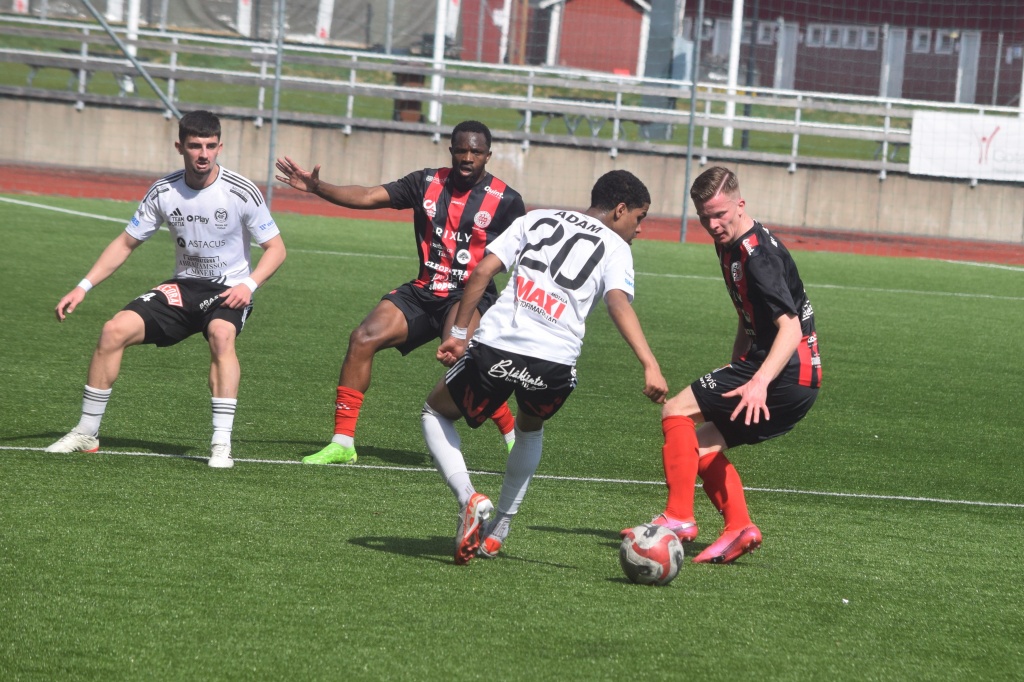 Abduwahab Adam ser ut att tappa bollen i kamp med Viktor Arthur. Louis Souffo som backup