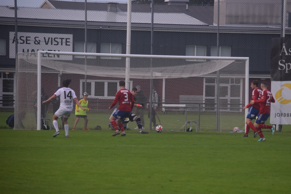 Bildserie, bild 2 av 2 Alfred Larsson klarar skottet men bollen studsar sedan tillbaka till David Björnsson som nu skjuter i stolpen och på nästa läge sätter Anton Henriksson 1-1