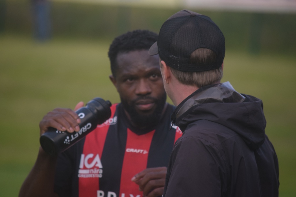 Louis Souffo dricker vatten och får instruktioner av Mattias Svensson
