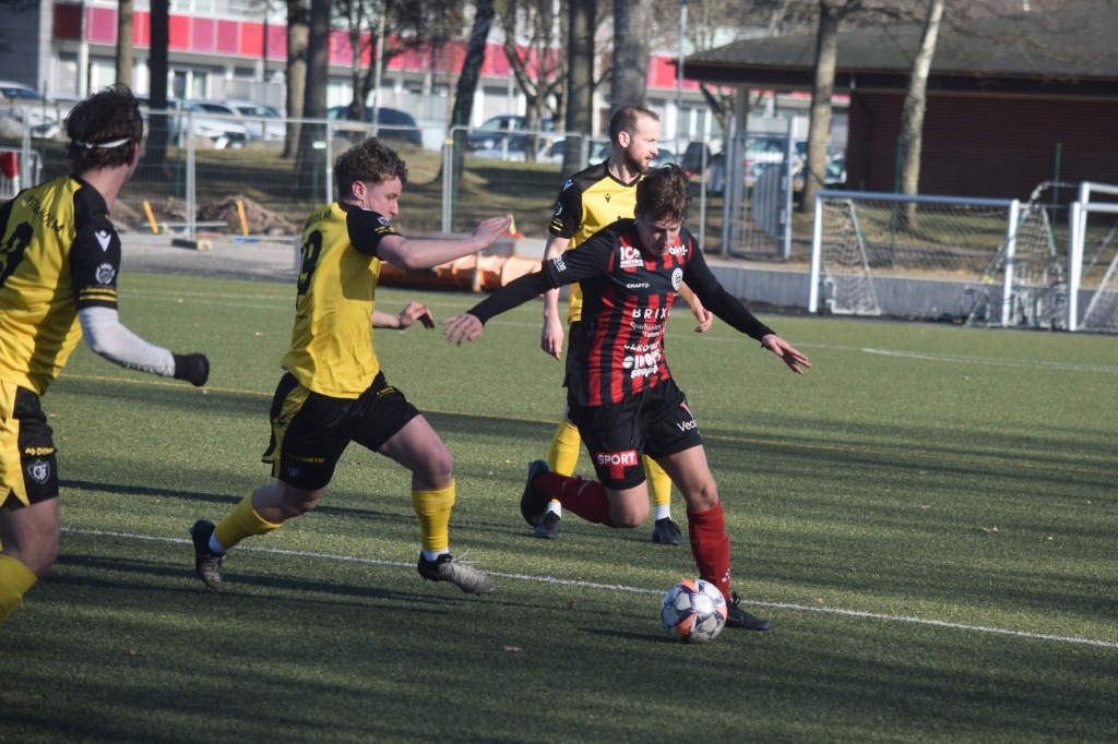 Victor Edvardsson försöker löpa runt och strax efter denna bild fick Victor lämna planen efter två snabba gula kort och därmed även ett rött.