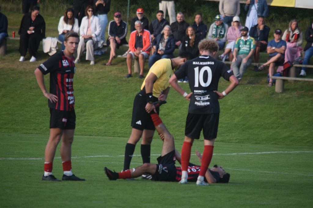 Kevin Yazbek med krampkänning och får hjälp av domaren