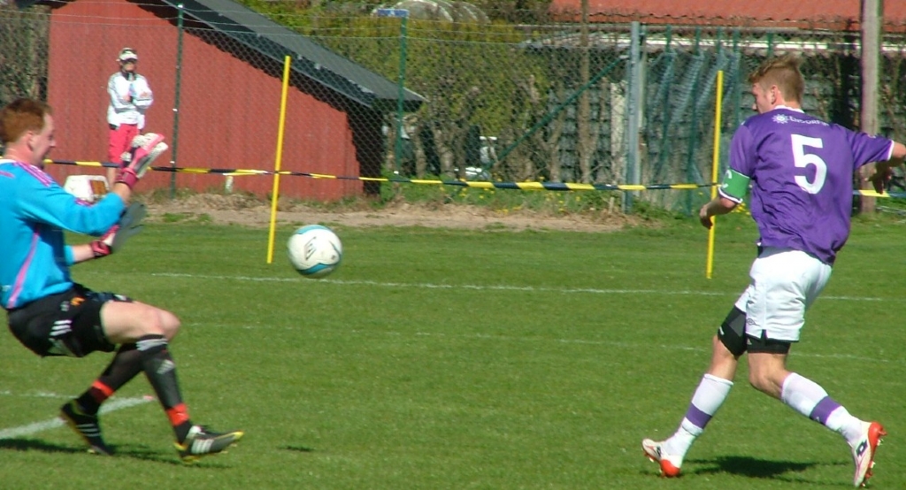 Lerums Fredrik Berntsson fri och sätter säkert 2-1 för hemmalaget. Martin Hansson chanslös på det fina avslutet.