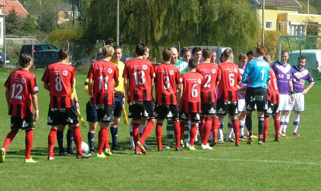 Lerum och Grebbestad samt domarteamet hälsar på varandra före matchen.