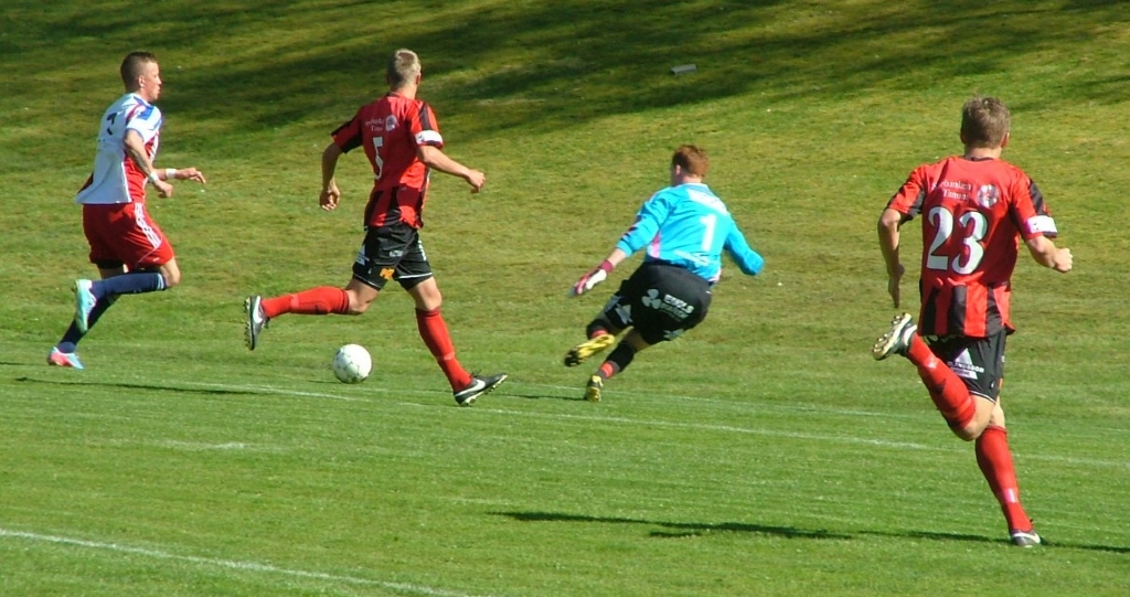 Sonny Karlsson mot Martin Hansson. Det hela slutar med inspark för Grebbestad. Ulrik Karnström och David Olsson är med hem och hjälper till.