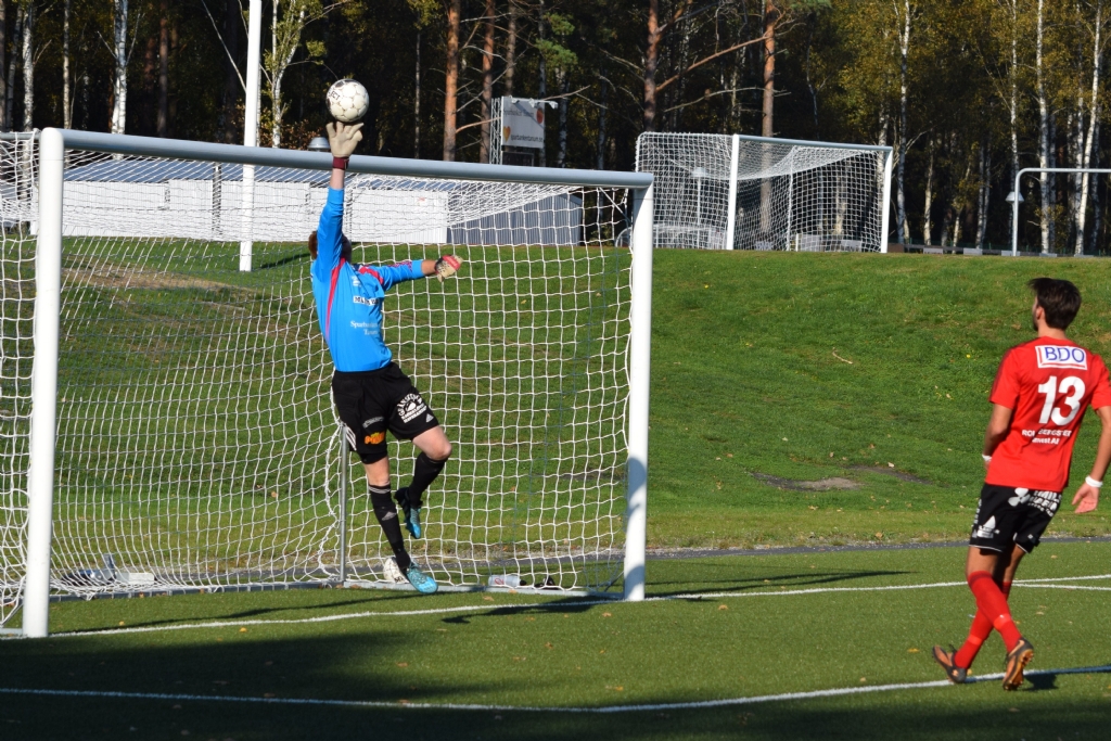 En lurig frispark från Nordvärmland som studsar mellan backlinje och mål. Martin Hansson får sträcka på sig för att nå bollen och tippa till en hörna.