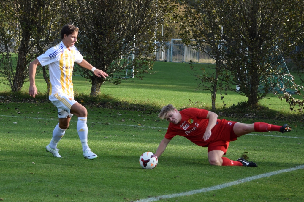 Torslandas Christopher Lenning halkar och faller och Daniel Andersson kan enkelt lägga beslag på bollen.