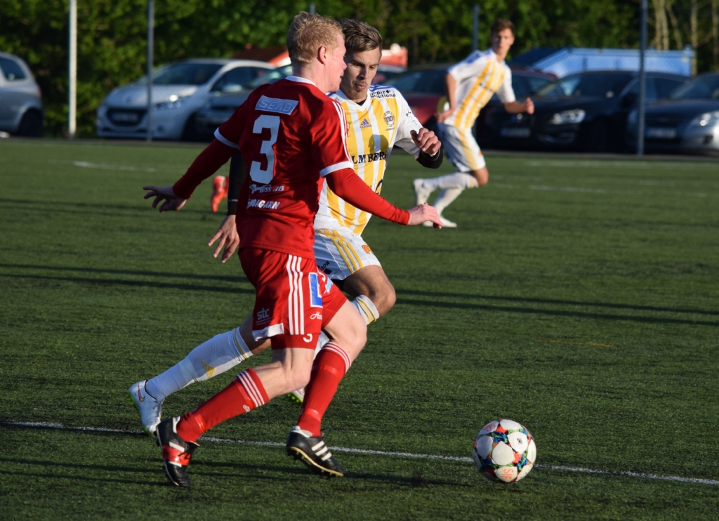 Stenungsunds Björn Niklasson skall göra ett uppspel och jagas av Grebbestads Olle Kristoffersson