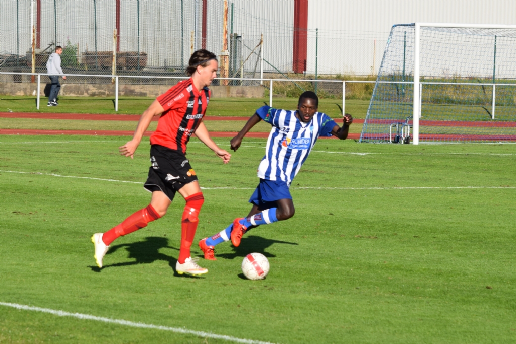 Tobias Berntsson jagas av Strömstads målskytt i matchen Colins Omondi