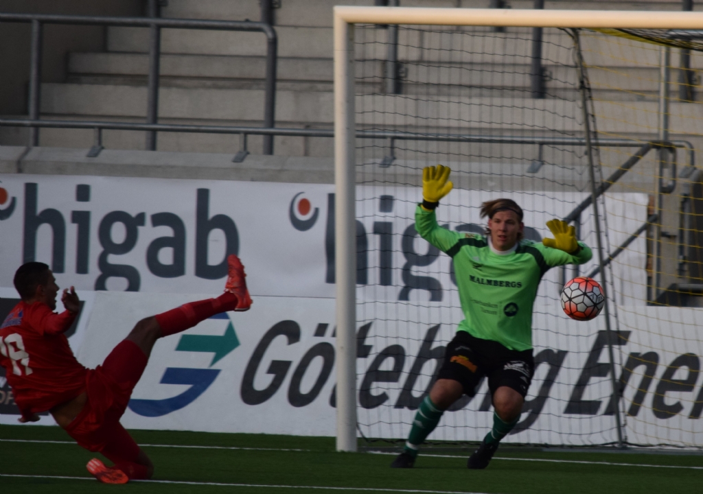 bra inspel för Torslanda med forwarden når inte riktigt bollen framför Marcus Gerd