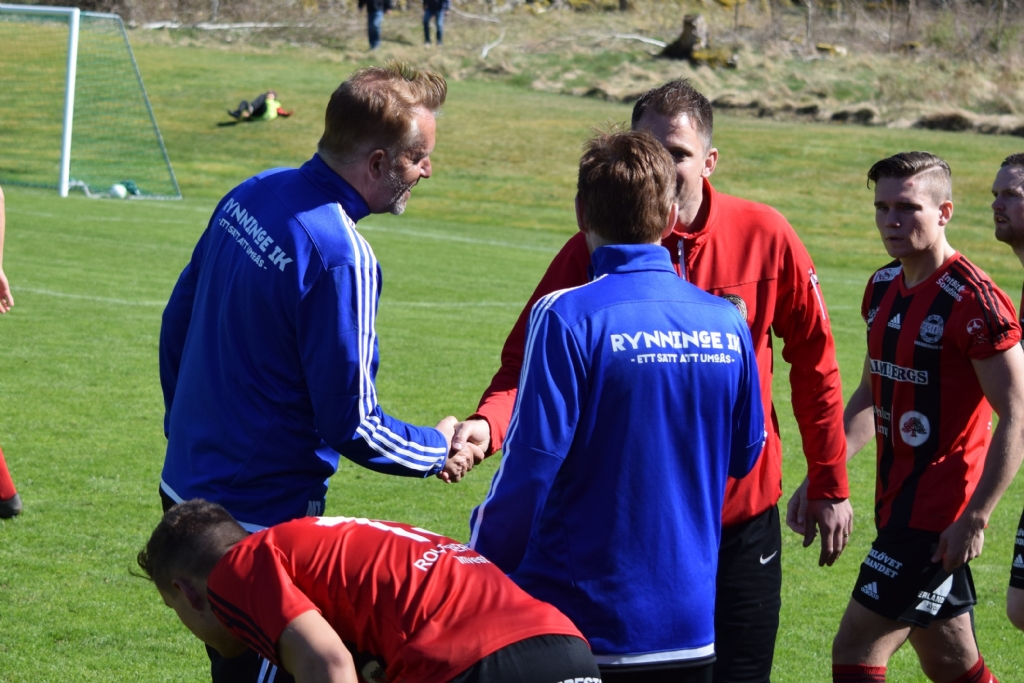 Rynninges ledare framme och hälsar på Mattias Pettersson-Pohl före matchen