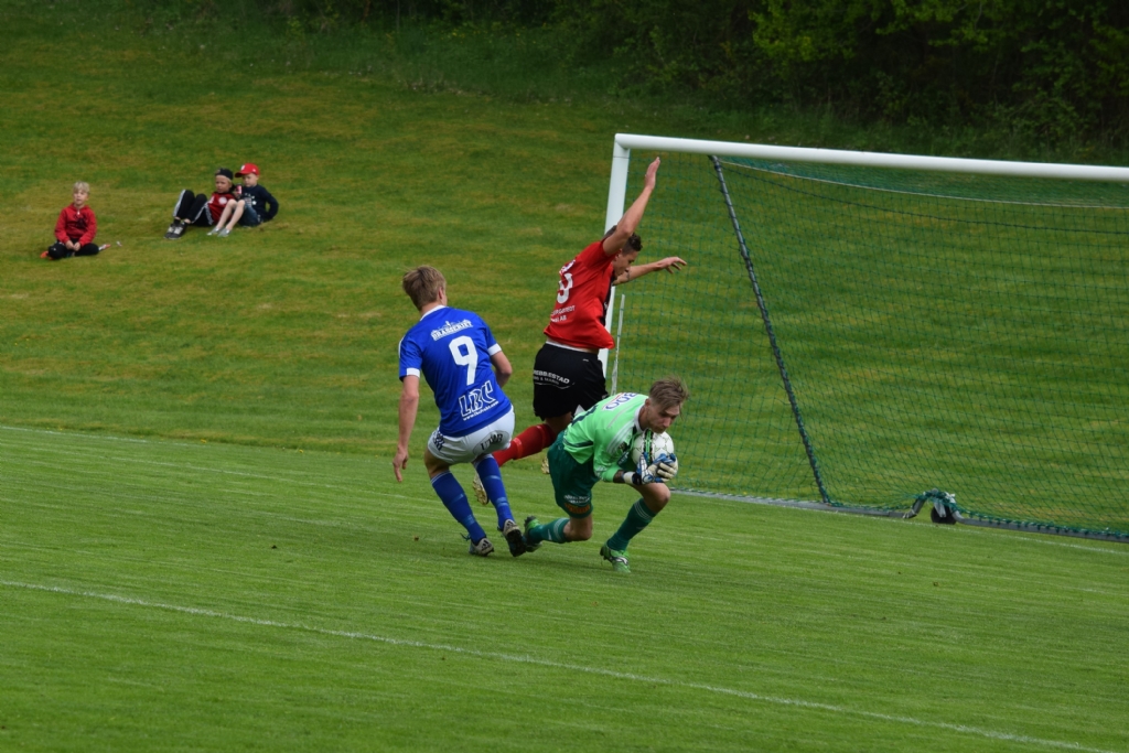 Martin Pettersson kommer ut och lägger beslag på bollen då Edon Qeriqi täcker hem bollen