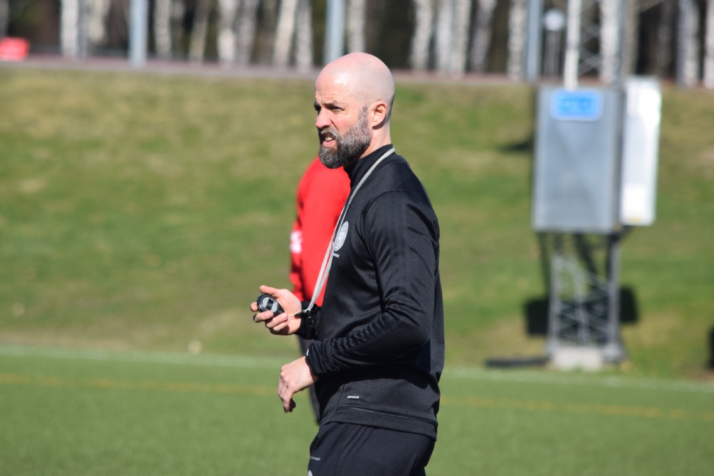 Matti Demegård bevakar uppvärmningen på sin första seriematch med Grebbestad