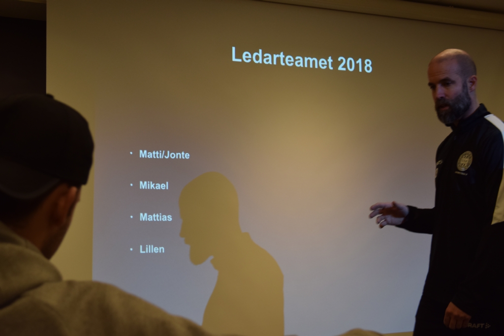 Matti Demegård visar bild på ledarstaben där det är nytt att skadade spelaren Mattias Svensson kommer att ingå som en resurs
